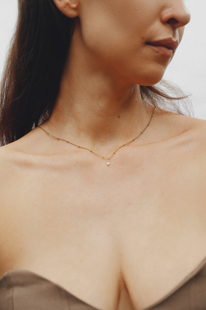 Ce joli collier fin composé d'une chaîne perlée scintillante habillera votre cou avec pendentif cristal et tombera parfaitement dans vos dos nus avec son pendentif.